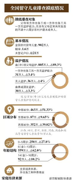 在昨日召開的農(nóng)村留守兒童關(guān)愛保護(hù)工作部際聯(lián)席會議上,民政部副部長高曉兵透露了此次摸底排查的結(jié)果。據(jù)她介紹,此次摸底排查開始于今年3月底,排查結(jié)果顯示,全國農(nóng)村留守兒童902萬人。