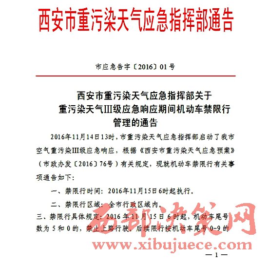記者從西安市重污染天氣應(yīng)急指揮部了解到,2016年11月14日13時(shí),西安市重污染天氣應(yīng)急指揮部啟動(dòng)了西安市空氣重污染Ⅲ級(jí)應(yīng)急響應(yīng)。根據(jù)《西安市重污染天氣應(yīng)急預(yù)案》(市政辦發(fā)〔2016〕76號(hào))有關(guān)規(guī)定,現(xiàn)就機(jī)動(dòng)車(chē)禁限行有關(guān)事項(xiàng)通告如下: