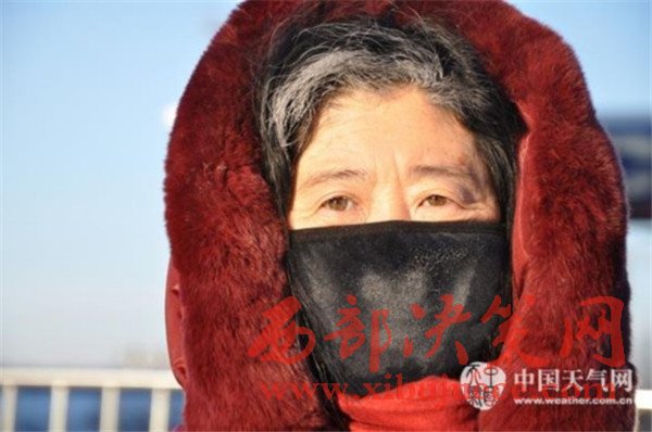 由于天氣寒冷,內(nèi)蒙古海拉爾的一位市民口罩結(jié)滿冰霜。