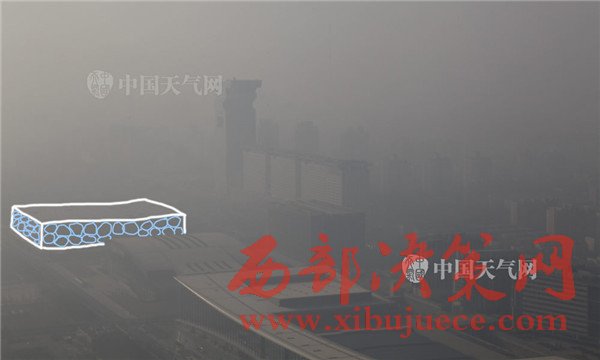 2016年12月19日早晨,北京持續(xù)空氣重污染。記者登上246.8米高的北京奧林匹克塔,鳥瞰北京城,發(fā)現(xiàn)咫尺之遙的鳥巢、水立方等奧運場館和城市地標建筑被霾“吞沒”,消失不見。圖為鳥巢。