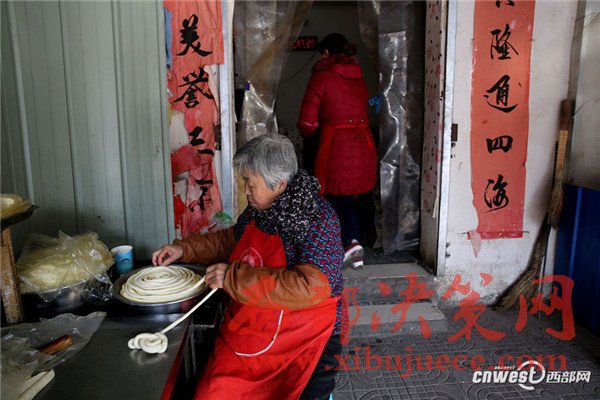 西安南二環(huán)附近的一條小巷里,新安醫(yī)院門口,70歲的賀玉蘭老人和兒媳劉艷寧在她們的實(shí)惠面館里忙碌著,揉面、拉條子、下面、給食客端面,婆媳倆默契得就像一個人,“二人成一心,黃土變成金。” 賀玉蘭老人喜歡老家蒲城的這句老話。