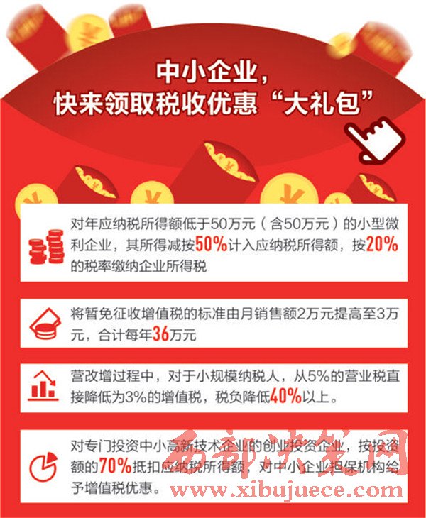日前國務院常務會議決定,在今年已出臺4批政策減稅降費7180億元的基礎上,繼續(xù)出臺多項降費舉措,預計每年可再減輕企業(yè)負擔2830億元,合計全年為企業(yè)減負超過1萬億元。今年以來,國家持續(xù)推出減稅降費措施,讓企業(yè)輕裝上陣,成為推進供給側結構性改革、培育我國競爭新優(yōu)勢的重要舉措。就在國務院出臺多項降費舉措的同時,財政部、國家稅務總局也發(fā)出通知,將享受所得稅優(yōu)惠政策的小型微利企業(yè)年應納稅所得額上限由30萬元提高至50萬元,自2017年1月1日至2019年12月31日,對年應納稅所得額低于50萬元(含50萬元)的小型微利企業(yè),其所得減按50%計入應納稅所得額,按20%的稅率繳納企業(yè)所得稅。