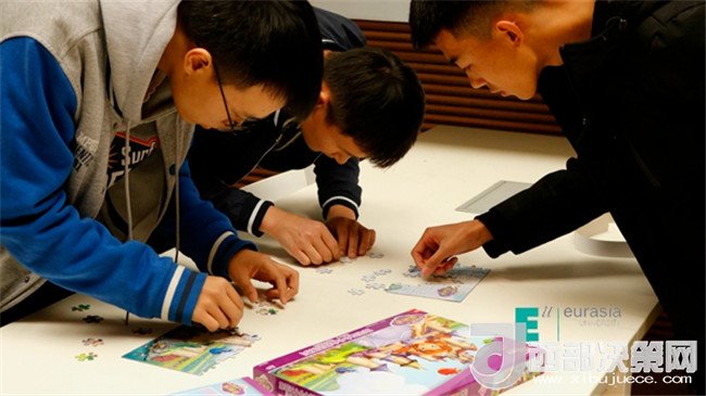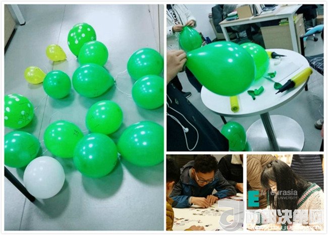 土豆和西紅柿根本就不是一個(gè)世界的,但它們走到了一起,變成了薯?xiàng)l和番茄醬它倆就是絕配;學(xué)籍制度和競(jìng)技運(yùn)動(dòng)也不是一個(gè)世界的,但它們?nèi)诤显诹艘黄穑兂闪祟^腦風(fēng)暴和趣味運(yùn)動(dòng)它們也可以很般配,現(xiàn)在就讓我們來(lái)看看它們是怎么融合的……聽(tīng)那陣陣氣球爆炸的聲音,他們開(kāi)始了!在這些綠油油的氣球中有事先設(shè)置的題目隊(duì)員們要先擠爆氣球答完題才能得到下一個(gè)地方的線索,“補(bǔ)考成績(jī)不合格以及成績(jī)低于50分必須怎樣?”“本科選修課學(xué)分不得低于多少學(xué)分?”這些題是不是還要開(kāi)動(dòng)腦袋瓜仔仔細(xì)細(xì)的想想才有答案呢?在比賽的現(xiàn)場(chǎng)一秒都會(huì)和對(duì)手拉開(kāi)差距,容不得一絲猶豫拿到線索的隊(duì)員們又奔向下一個(gè)地點(diǎn)熟悉的教室,這里也不是那么容易通過(guò),看著黑板上的題“冰怎么很快的化成水?”“可替代大學(xué)英語(yǔ)四級(jí)成績(jī)的考試有哪些?”哦,還有計(jì)算題,隊(duì)員們必須腦洞大開(kāi),腦細(xì)胞飛速運(yùn)轉(zhuǎn),做學(xué)霸那也是不容易的。只見(jiàn)黑板上粉筆一起一落,答題完畢,看看線索迅速趕往下一地點(diǎn)——地中海。這里指壓板、跳繩早已準(zhǔn)備好等著隊(duì)員們,學(xué)霸不能只管學(xué)習(xí)身體素質(zhì)也很重要,動(dòng)起來(lái)吧!在指壓板上跳繩,誰(shuí)想出來(lái)的?忍受著腳底的疼痛還要揮動(dòng)跳繩?太受虐,但是我們是一群不屈不撓的新一代,指壓板上跳繩我們也是鏗鏘有力、一絲不茍。終于結(jié)束痛并快樂(lè)著的跳繩環(huán)節(jié),卻看到了整整400塊的拼圖,這個(gè)環(huán)節(jié)真是讓人又愛(ài)又恨,還記得兒時(shí)玩拼圖的快樂(lè),但在這激烈的競(jìng)爭(zhēng)環(huán)境下,卻是讓人有點(diǎn)心慌和畏懼。隊(duì)員們最終齊心協(xié)力戰(zhàn)勝了它,細(xì)心、耐心的逐一完好的拼完了每一副圖。