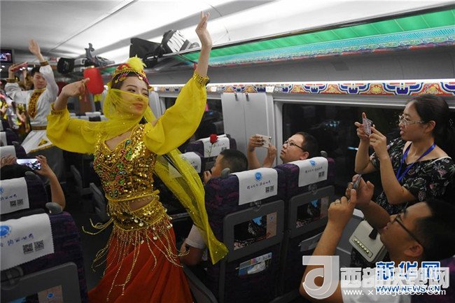 蘭州客運(yùn)段列車員在蘭州鐵路局開行的首趟寶蘭高鐵G2028次動(dòng)車組上為旅客表演節(jié)目(7月9日攝)。7月9日,寶雞至蘭州高鐵正式開通運(yùn)營(yíng),西北的甘肅、青海、新疆由此融入全國(guó)高鐵大家庭。