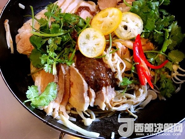 材料:金桔,香菜,金針菇,紅椒,熟鴨脯,姜絲。