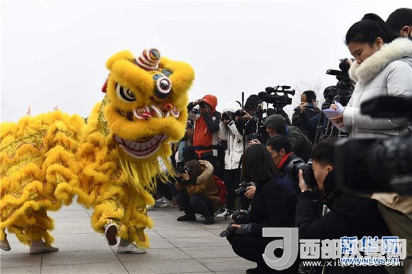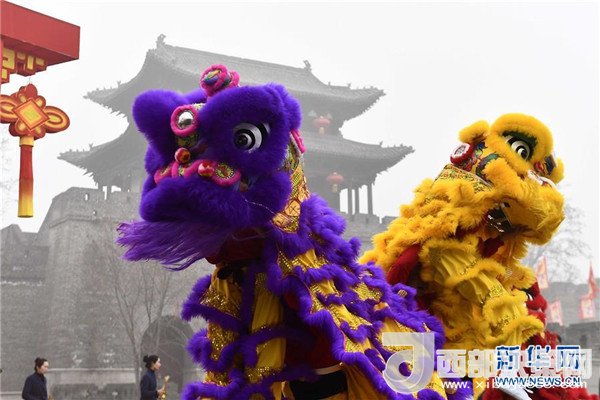 1月1日,在臺兒莊古城開福門儀式上,民間藝人在表演舞獅。(記者 郭緒雷 攝)