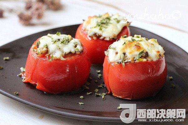 7、到時(shí)取出烤盤(pán),西紅柿裝盤(pán),撒少許的干蔥即可。