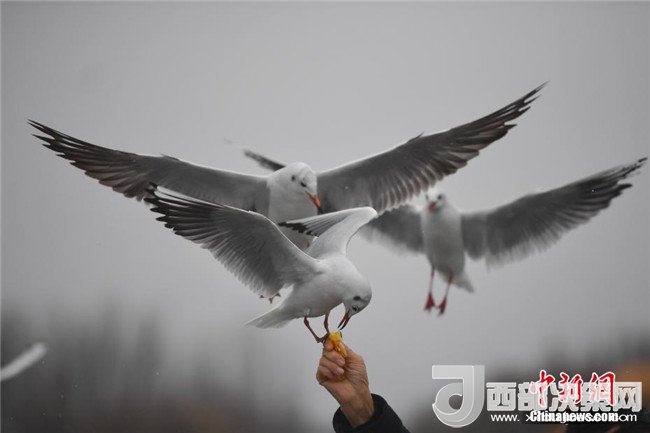 1月3日,紅嘴鷗在滇池邊與游客親密接觸。當日,“春城”昆明淅淅瀝瀝的小雨下個不停,仍有眾多游客和市民來到滇池邊,與西伯利亞的“白色精靈”——紅嘴鷗相會,領略昆明別樣美景。(記者 劉冉陽 攝)