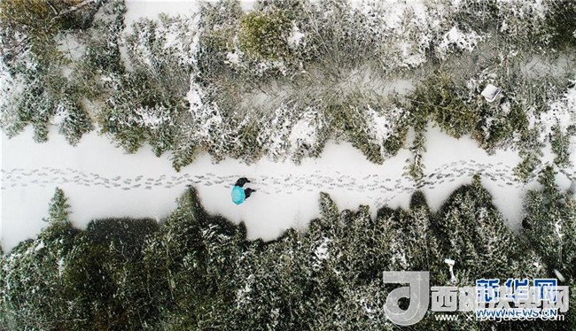 1月4日,合肥市翡翠湖公園內,兩名游客行走在雪中。當日,安徽省合肥市迎來2018年首場降雪。(記者 郭晨 攝)