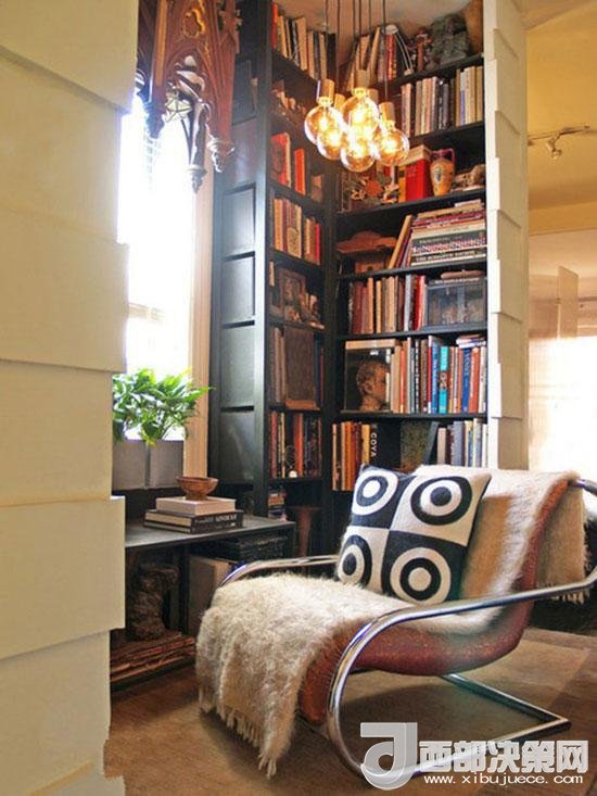 一個(gè)局促的轉(zhuǎn)角,被打造成了藏書(shū)空間,黑色的書(shū)架顯得厚重大氣,塞滿書(shū)本以后更有沉淀韻味。坐在舒適的躺椅上閱讀,體驗(yàn)有滋有味的生活。