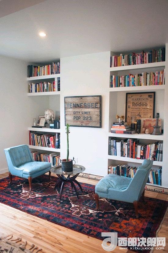 在墻面上掏出置物空間,讓書(shū)籍切切實(shí)實(shí)地成為家的一部分,左右對(duì)稱(chēng)的設(shè)計(jì)十分美觀,旁邊的兩把單人沙發(fā)相對(duì)而坐,兩個(gè)人的書(shū)房要來(lái)得更加溫馨。