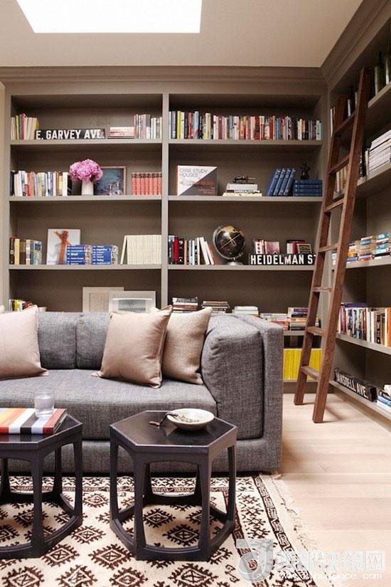 把全部的墻面都用來(lái)打造書(shū)架,用成摞的書(shū)本塞得滿滿當(dāng)當(dāng),充實(shí)感油然而生。高處的書(shū)本也不怕夠不到,只要有一把梯子就能解決問(wèn)題。