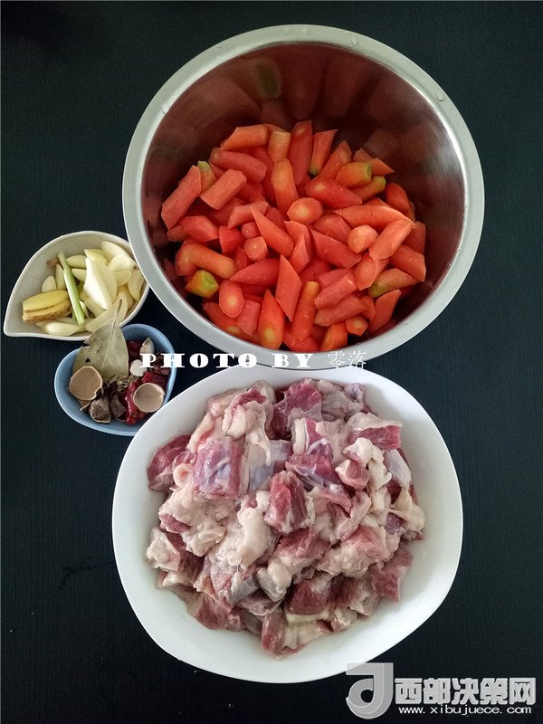 1.備好食材:牛腩洗凈,用清水浸泡30分鐘左右;再次洗凈后;切塊;胡蘿卜去皮,洗凈切滾刀狀;再備好調(diào)料:姜片、蒜瓣、蔥段、干辣椒段、花椒、草果、香葉、三奈、小茴香、八角;草果拍碎,更出味;