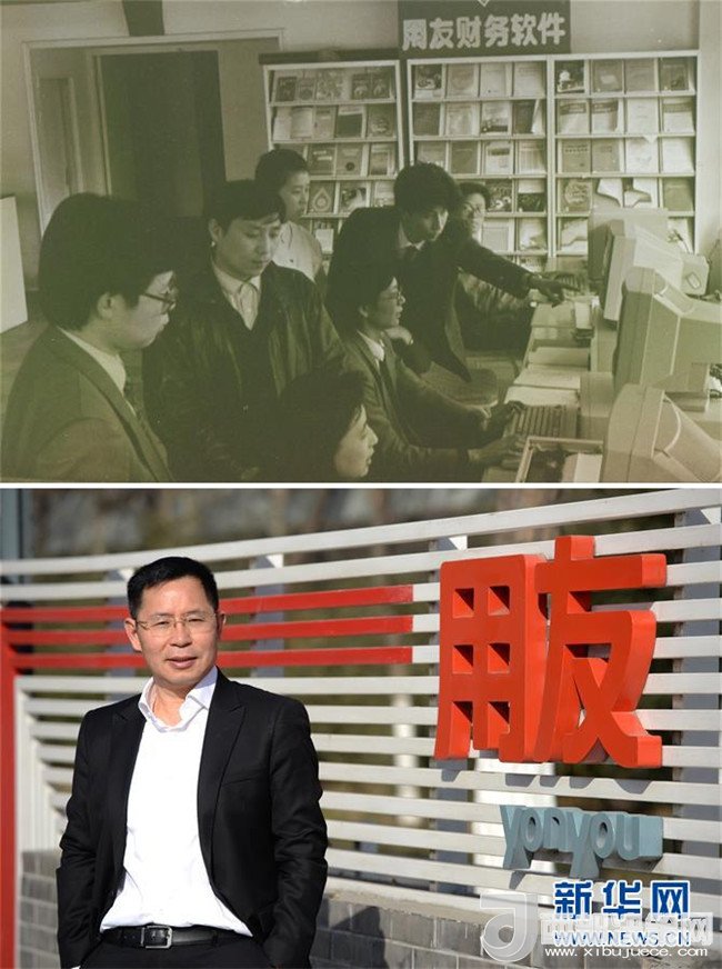 拼版照片:上圖為1989年的用友;下圖為用友網(wǎng)絡(luò)董事長兼CEO王文京(資料照片)。用友是中關(guān)村第一個拿到私營高新技術(shù)企業(yè)牌照的企業(yè),編號“SY0001”。從創(chuàng)業(yè)時2個人的軟件服務(wù)社,到30年后的1.5萬人,用友正從管理軟件公司向為企業(yè)“賦能”的知名云服務(wù)企業(yè)邁進(jìn)。新華社發(fā)
