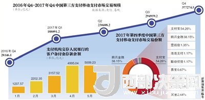 在移動(dòng)支付市場上,支付寶和擁有財(cái)付通、微信支付的騰訊金融雙寡頭局勢顯現(xiàn)。今年4月,易觀2017年第四季度中國第三方支付移動(dòng)支付市場數(shù)據(jù)顯示,第三方移動(dòng)支付市場交易規(guī)模為37.7萬億元,環(huán)比增長27.91%。其間支付寶和騰訊金融兩巨頭的份額分別為54.26%和38.15%,合計(jì)92.41%。