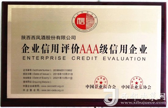 西鳳股份公司榮獲全國“AAA級信用企業(yè)”榮譽(yù)稱號