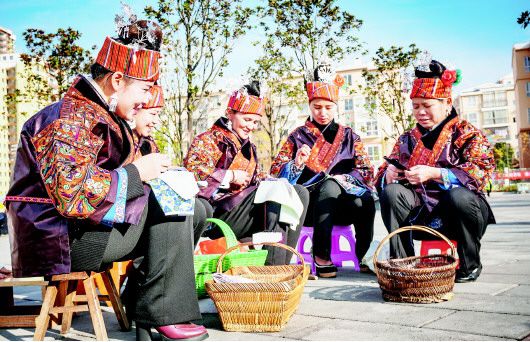 圖1:公交車開進(jìn)凱里市上馬石易地扶貧搬遷安置小區(qū)。圖2:凱里市上馬石易地扶貧搬遷安置點(diǎn)廣場(chǎng)上的繡娘。(凱里市宣傳部供圖)