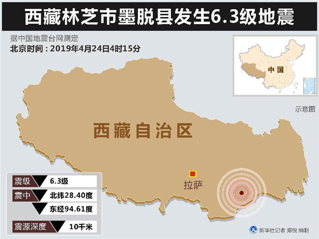 4月24日4時15分,在西藏林芝市墨脫縣(北緯28.40度,東經(jīng)94.61度)發(fā)生6.3級地震,震源深度10千米。林芝消防力量已趕赴震中應急處置,向當?shù)亓私獾那闆r顯示,中心區(qū)域震感強烈。(記者葉昊鳴)