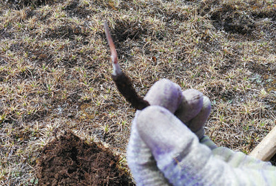 發(fā)現(xiàn)蟲(chóng)草后,拉姆用鋤頭小心地翻起一塊草皮,拔出了一根蟲(chóng)草。 |