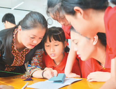 國家級非遺項目瑤族服飾傳承人李素芳(左一)指導(dǎo)營員編織瑤繡