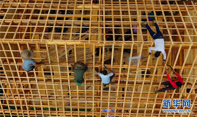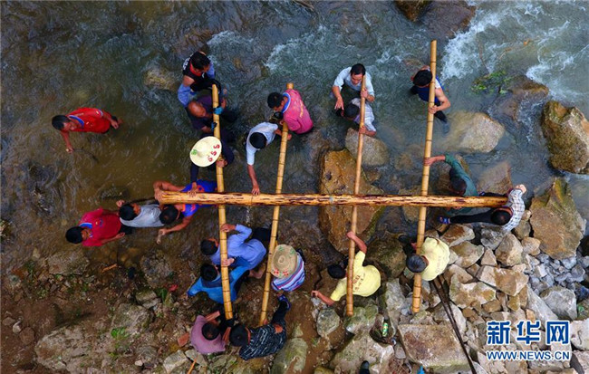 在黔桂烏英苗寨,群眾在幫助貧困戶吳仕足修建新木樓(9月3日無人機拍攝)。