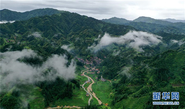 這是位于大山深處的黔桂烏英苗寨(7月6日無人機拍攝)。