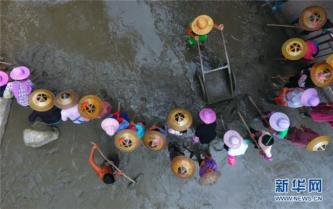 在黔桂烏英苗寨,群眾在修河堤(7月3日無人機拍攝)。
