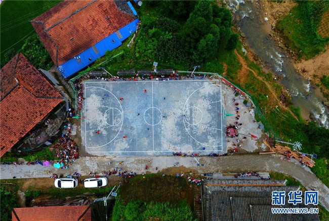 黔桂烏英苗寨的群眾在打籃球(7月19日無人機拍攝)。