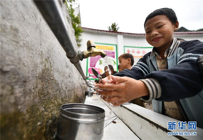 在廣西大化瑤族自治縣板升鄉(xiāng)八好小學(xué),一名學(xué)生用儲(chǔ)備在水桶里的雨水淘米煮飯(2014年11月24日攝)。八好小學(xué)有400多名學(xué)生,曾僅有一個(gè)不足100立方米的水柜,用于收集儲(chǔ)存樓頂?shù)挠晁瑢W(xué)生需定期定量用水。遇到長(zhǎng)時(shí)間不下雨,學(xué)校需要到鄉(xiāng)政府所在地運(yùn)水。如今,學(xué)校修建了5個(gè)大水柜,并從兩公里外引泉水到校園,“飲水難”問題得到解決。 新華社記者 黃孝邦 攝