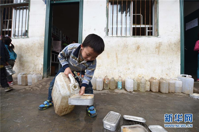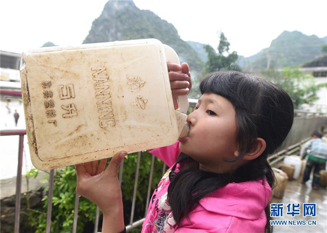 在廣西大化瑤族自治縣板升鄉(xiāng)八好小學(xué),一名學(xué)生喝水桶里的雨水(2014年11月24日攝)。八好小學(xué)有400多名學(xué)生,曾僅有一個(gè)不足100立方米的水柜,用于收集儲(chǔ)存樓頂?shù)挠晁?,學(xué)生需定期定量用水。遇到長(zhǎng)時(shí)間不下雨,學(xué)校需要到鄉(xiāng)政府所在地運(yùn)水。如今,學(xué)校修建了5個(gè)大水柜,并從兩公里外引泉水到校園,飲水難問題得到解決。 新華社記者 黃孝邦 攝