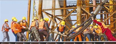 3月15日,廣東汕頭,建設者為榕江特大橋首榀鋼箱梁吊裝鋼繩。紀順利攝(影像中國)