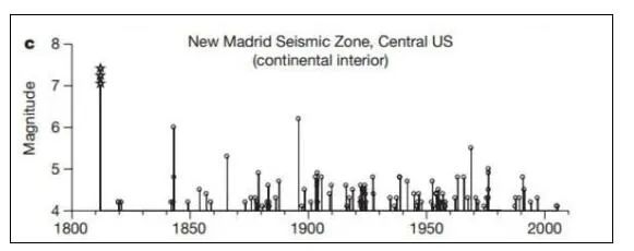 例如,在1811-1812年間,位于北美板塊內(nèi)部的美國密蘇里州的紐馬德里地區(qū)曾發(fā)生過三次7.0-7.4級地震。盡管地震已經(jīng)過去兩百多年,但一直到2000年為止,該地區(qū)的小震依然很活躍,研究人員認(rèn)為這些小震是大地震的余震。