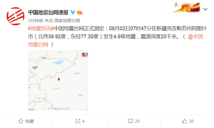 中國地震臺(tái)網(wǎng)正式測(cè)定:08月02日07時(shí)47分在新疆克孜勒蘇州阿圖什市(北緯39.92度,東經(jīng)77.30度)發(fā)生4.6級(jí)地震,震源深度20千米。