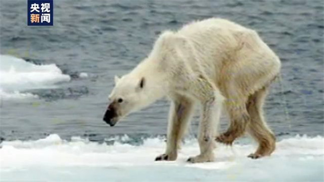 ▲圖為德國(guó)攝影師于2015年拍攝到的一只瘦骨嶙峋的北極熊。圖片來源:央視新聞。