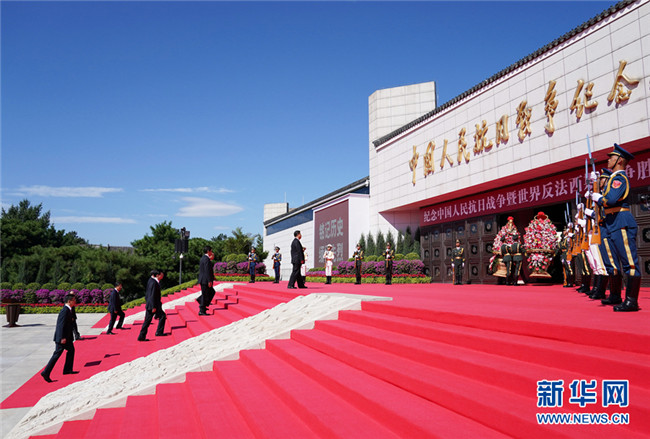 9月3日上午,習(xí)近平、李克強(qiáng)、栗戰(zhàn)書、汪洋、王滬寧、趙樂際、韓正、王岐山等黨和國(guó)家領(lǐng)導(dǎo)人來到中國(guó)人民抗日戰(zhàn)爭(zhēng)紀(jì)念館,出席紀(jì)念中國(guó)人民抗日戰(zhàn)爭(zhēng)暨世界反法西斯戰(zhàn)爭(zhēng)勝利75周年向抗戰(zhàn)烈士敬獻(xiàn)花籃儀式。 新華社記者 丁海濤 攝