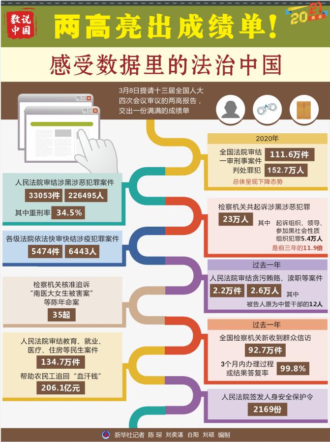 8日提請十三屆全國人大四次會議審議的兩高報告,交出一份滿滿的成績單。掃黑除惡“打傘破網(wǎng)”、嚴懲腐敗守護平安、加強民生司法保障……一串串數(shù)字勾勒出法治中國建設的亮點。