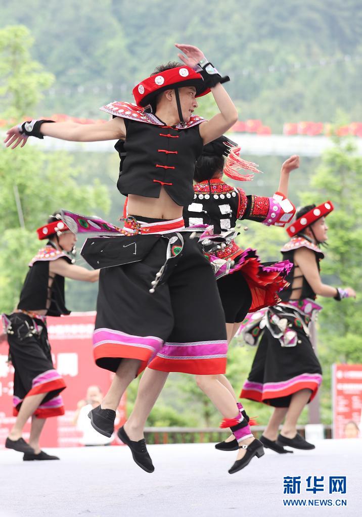 5月16日,演員在丹寨縣萬達(dá)小鎮(zhèn)非遺歌舞展演活動(dòng)上表演苗族木鼓舞。新華社發(fā)(黃曉海 攝)