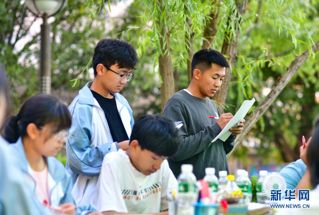 記者在這個特殊的“帳篷課堂”看到,學生們有的正在集中做著卷子,有的在復習課文,老師在一旁耐心講解。遠處,空置的教學樓懸掛著條幅,上面寫著“用拼搏的汗水灌注無悔的高三路 考前不怕 考后不悔”。