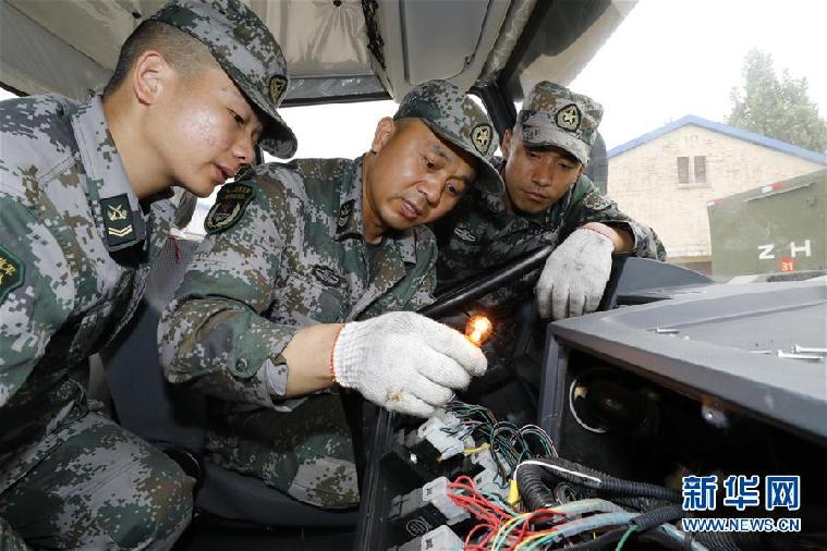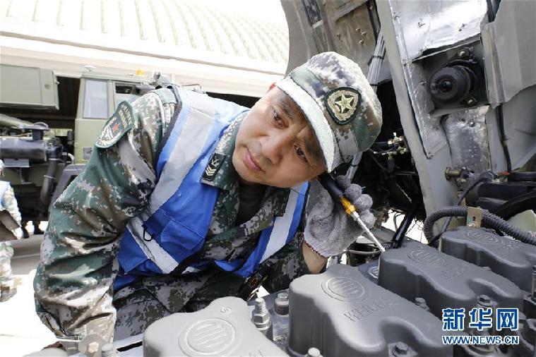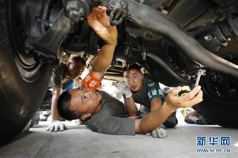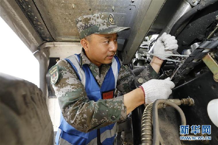 聯(lián)勤保障部隊(duì)某團(tuán)修理技師張俊凱在檢修車輛(2019年6月5日攝)。 新華社發(fā)(曾曾 攝)