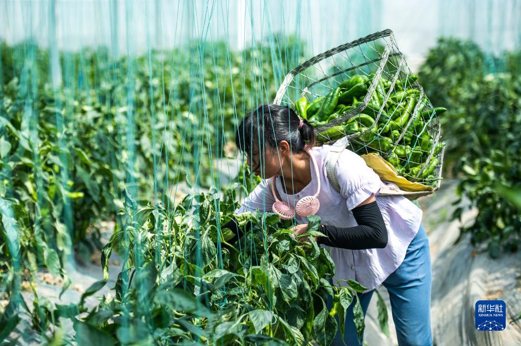 村民在貴陽農(nóng)投集團奇申蔬菜基地采收牛角椒(7月29日攝)。新華社記者 陶亮 攝
