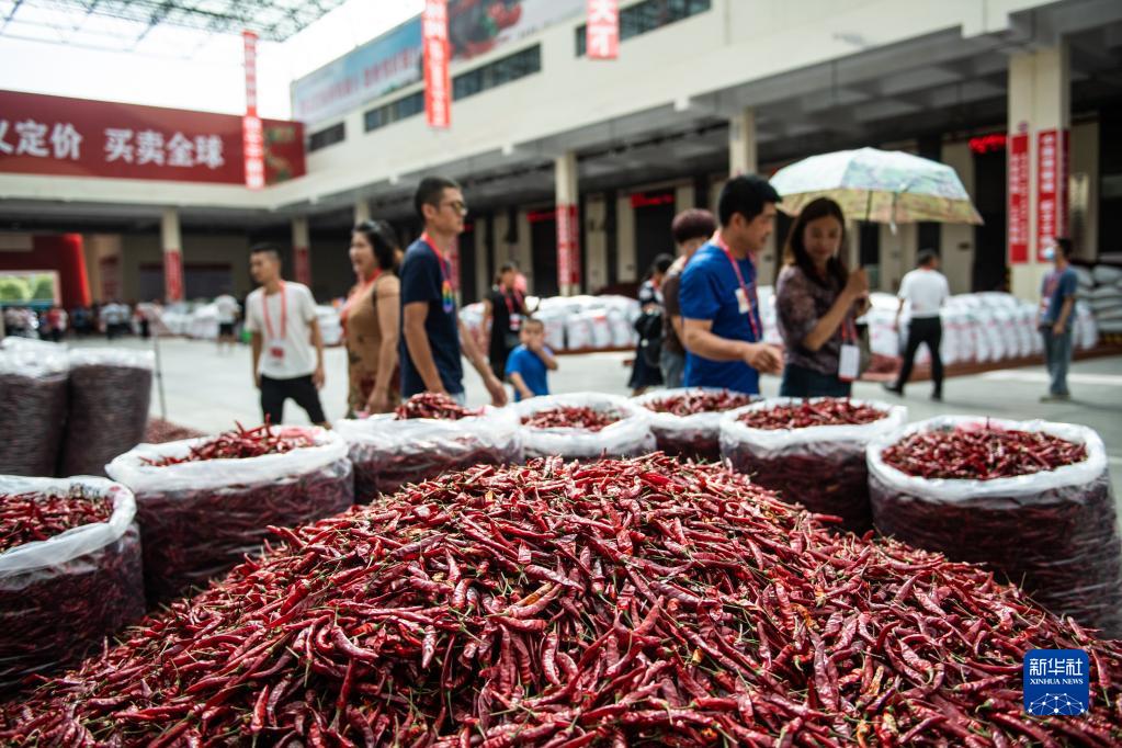 經(jīng)銷商在遵義市新蒲新區(qū)中國辣椒城挑選辣椒(2020年8月18日攝)。新華社記者 陶亮 攝