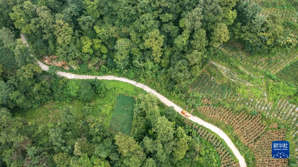 收購辣椒的小貨車行駛在貴州省湄潭縣梭塘村的鄉(xiāng)間小路上(8月29日攝,無人機照片)。新華社記者 陶亮 攝
