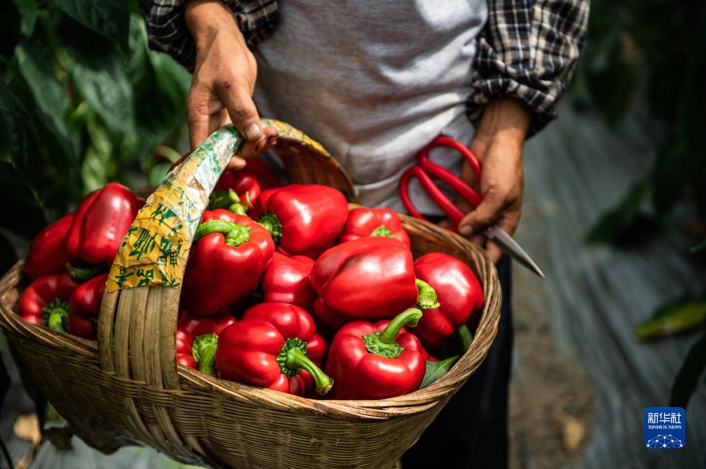 當(dāng)?shù)卮迕裨谫F陽農(nóng)投集團花溪蔬菜基地采收的柿子椒(7月30日攝)。新華社記者 陶亮 攝