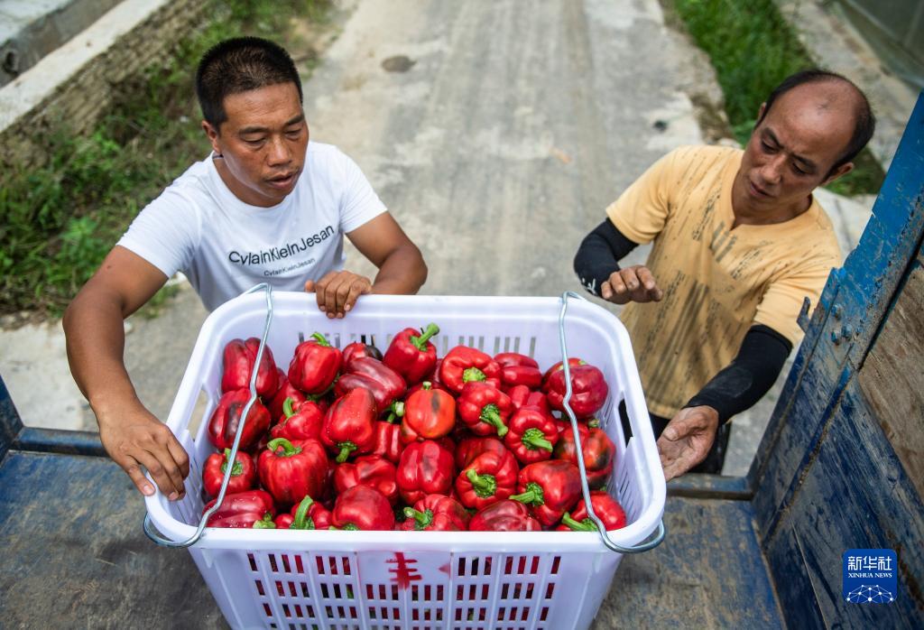 當(dāng)?shù)卮迕裨谫F陽農(nóng)投集團花溪蔬菜基地將采收好的柿子椒裝車(7月30日攝)。新華社記者 陶亮 攝