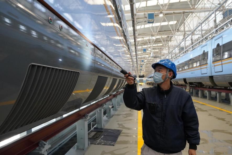 1月29日,在中國鐵路西安局集團公司西安動車段檢修庫內(nèi),質(zhì)檢車間質(zhì)檢三組質(zhì)檢員龔奇正檢查著動車組走行部位,手中的可錄式手電一一掃過車輪、齒輪箱、閘片等配件,眼隨手動,緊盯著手電光照的地方,時不時伸手確認配件安裝狀態(tài)。
