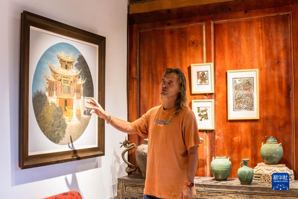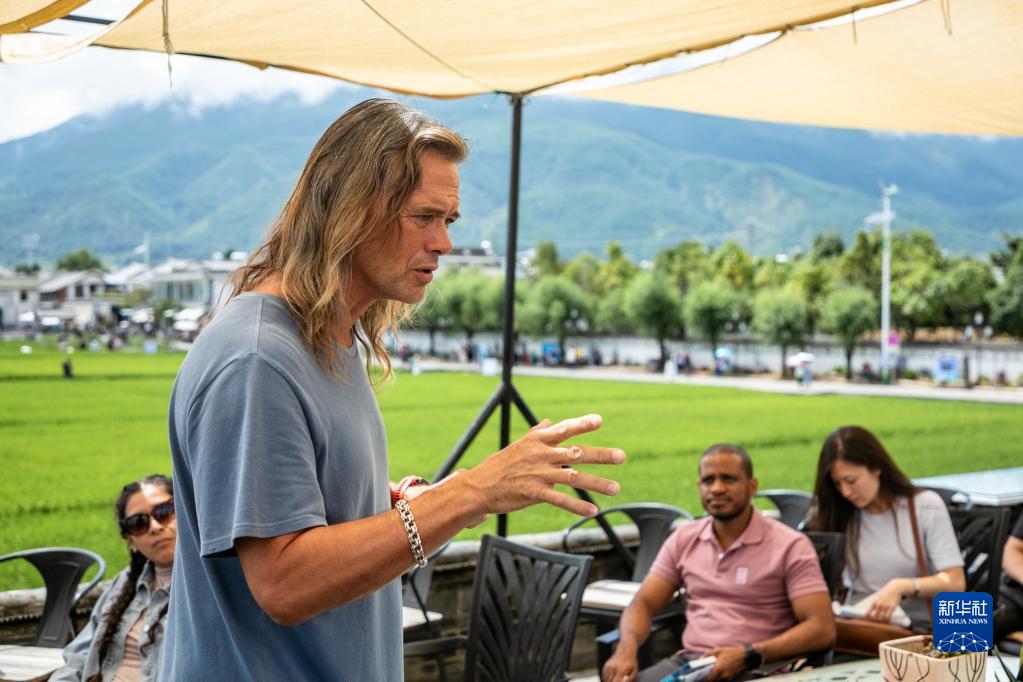 8月27日,林登在喜洲古鎮(zhèn)喜林苑向外國訪客介紹當(dāng)?shù)匚幕?。新華社記者 曹夢(mèng)瑤 攝