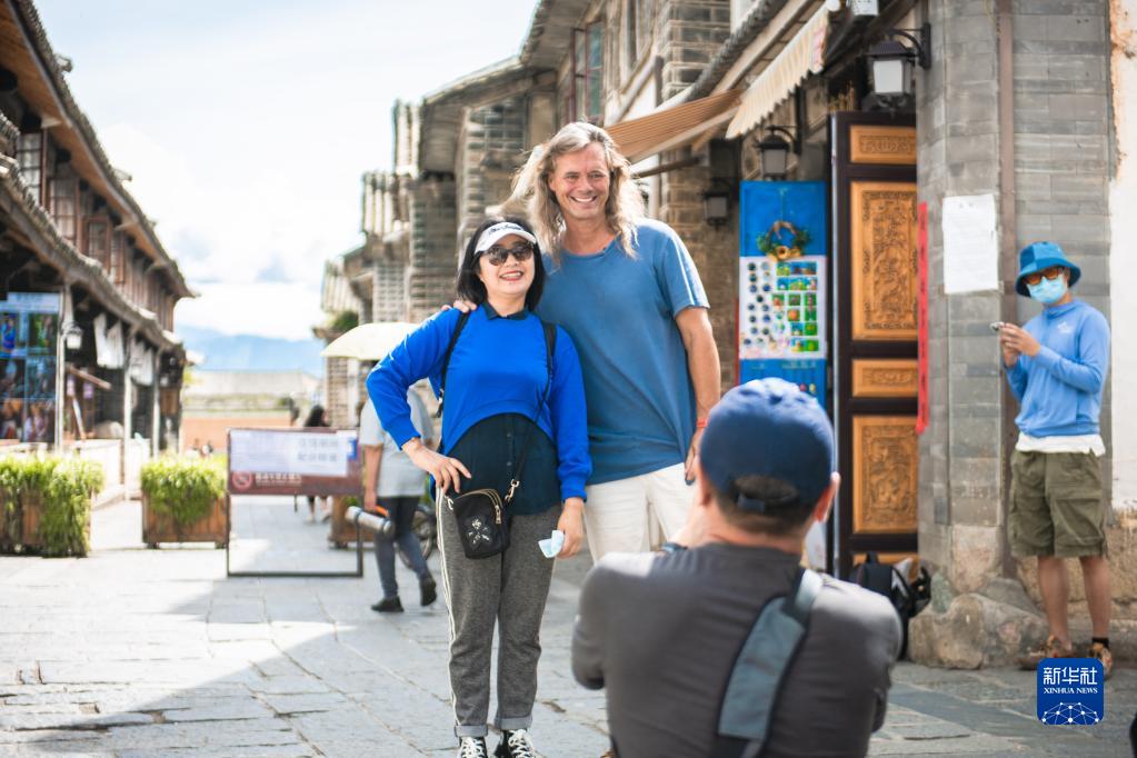 8月28日,林登在喜洲古鎮(zhèn)與游客合照。新華社記者 曹夢(mèng)瑤 攝