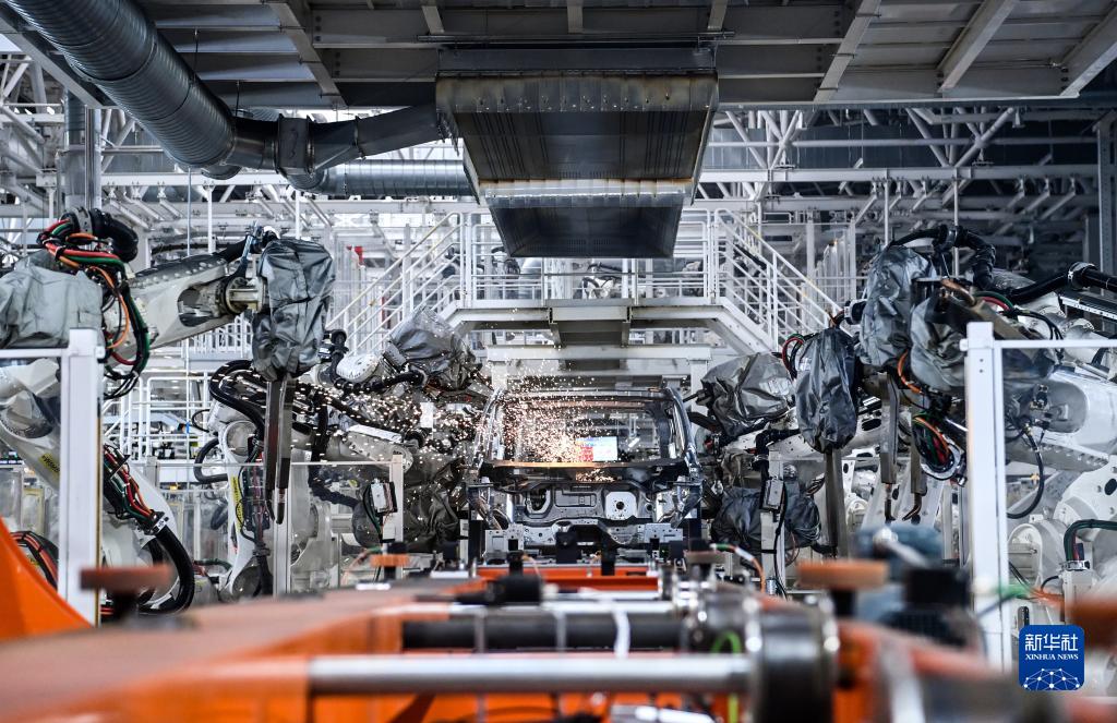 10月17日,在吉林長(zhǎng)春中國(guó)第一汽車集團(tuán)有限公司紅旗繁榮工廠焊裝車間內(nèi),焊裝機(jī)器人在生產(chǎn)線上焊接車身。新華社記者 顏麟蘊(yùn) 攝