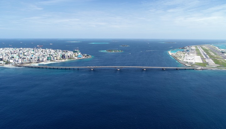 這是在馬爾代夫航拍的連接首都馬累和機場島的中馬友誼大橋(2019年8月30日攝)。新華社發(fā)(王明亮 攝)