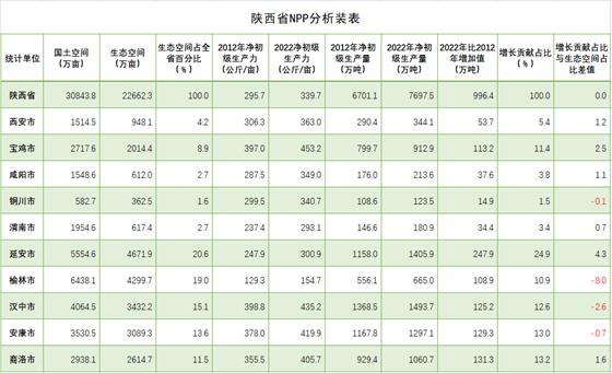 全省元生產(chǎn)力區(qū)域分析結(jié)果表明,在三大區(qū)域生態(tài)蛋糕越來越大的同時(shí),生態(tài)蛋糕的空間布局上與結(jié)構(gòu)發(fā)生變化,呈現(xiàn)黃河流域綠色崛起大趨勢(shì)。陜北榆林、延安兩市,生態(tài)空間8971.6萬畝,占全省的39.6%;關(guān)中西安、寶雞、咸陽、渭南、銅川五市生態(tài)空間4554.5萬畝,占全省的29.2%;陜南漢中、安康、商洛三市生態(tài)空間9136.2萬畝,占全省的40.2%。2022年,陜北兩市提供了2070.9萬噸植被凈初級(jí)生產(chǎn)量,占全省的26.9%,比2012年的1714.1萬噸增加313.8萬噸,增長18.3%,在全省份額上升了1.3個(gè)百分點(diǎn);關(guān)中五市提供了1775.1萬噸的植被凈初級(jí)生產(chǎn)量,占全省的23.1%,比2012年的1524.3萬噸250.8萬噸,增長16.4%,在全省份額上升了0.3個(gè)百分點(diǎn);陜南三市提供了3851.5萬噸植被凈初級(jí)生產(chǎn)量,占全省的50.0%,比2012年的3462.7萬噸增加388.8萬噸,增長11.2%,在全省份額下降了1.6個(gè)百分點(diǎn)。2012-2022年全省新增生態(tài)蛋糕996.4萬噸,陜北兩市貢獻(xiàn)31.5%,關(guān)中五市貢獻(xiàn)29.5%,陜南三市貢獻(xiàn)39.0%。陜北、關(guān)中提供的生態(tài)蛋糕占全省的份額已由2012年的48.4%提高到2022年的50.0%。